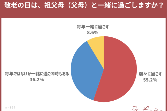敬老の日.jpでは「敬老の日は、祖父母(父母)と一緒に過ごしますか?」という質問で、全国の10代~60代の男女(計359名)を対象に、敬老の日に関するアンケート調査を実施しました。 調査概要 調査エリア:全国 調査主体:敬老の日.jp 調査...