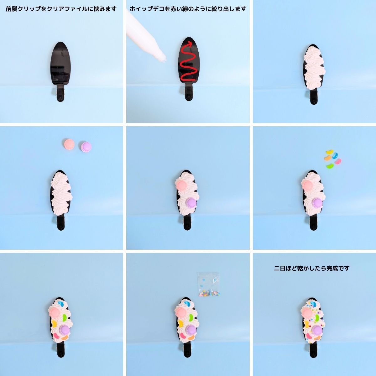 作り方はとっても簡単♪まずは前髪クリップの土台に、ホイップクリームのようなデコ素材を絞っていきます。そこへフェイクスイーツの小さなマカロンやお菓子を、まるで本物のデザートのように飾りつけ。仕上げに、キラキラ光るホログラムパーツをふりかければ完成です。